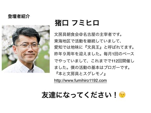 当ブログの管理者の、文房具ブロガー&ライターの猪口フミヒロと申します。タイトル画像は、先日(2019年2月24日)東急ハンズさんの『文具祭り2019』で登壇した時の表紙ページです。顔写真の変わりに使いますね。ブログを毎日書いていている僕は「自己紹介」…