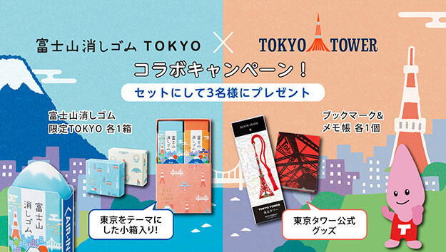 プラス公式TwitterアカウントとTOKYO TOWER公式Twitterアカウントをフォローし、キャンペーン対象ツイートをリツイートした方の中から、抽選で3名様に「エアイン 富士山消しゴム<限定>TOKYO」と「東京タワー公式グッズ」をセットにしてプレゼントするキャンペーンを実施します。